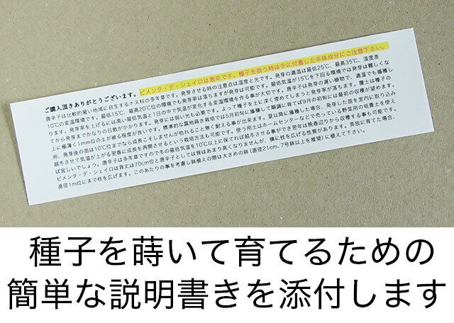 種をまく時の注意点や栽培時の要点などを簡単に記した説明書きを添付しますが、発芽の保証は致しませんのでその点もご承知おきください。