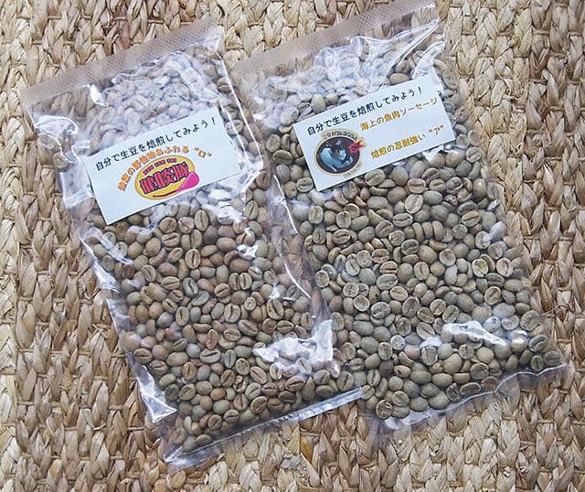 東南アジアで栽培されたコーヒー生豆、アラビカ種100g入り1袋とロブスタ種100g入り1袋のセットでの販売です。